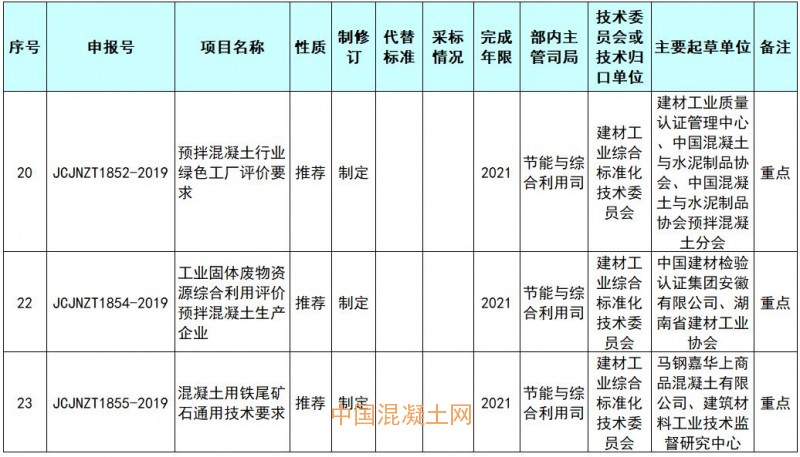 近日,工信部公開征集對72項(xiàng)行業(yè)標(biāo)準(zhǔn)計(jì)劃項(xiàng)目的意見,其中包含多項(xiàng)混凝土行業(yè)綠色制造標(biāo)準(zhǔn)項(xiàng)目。工信部對申請立項(xiàng)的72項(xiàng)行業(yè)標(biāo)準(zhǔn)計(jì)劃項(xiàng)目予以公示,截止日期為2019年9月1日。如對擬立項(xiàng)標(biāo)準(zhǔn)項(xiàng)目有不同意見,請?jiān)诠酒陂g填寫《標(biāo)準(zhǔn)立項(xiàng)反饋意見表》并反饋至工業(yè)和信息化部科技司,電子郵件發(fā)送至KJBZ@miit.gov.cn(郵件主題注明:標(biāo)準(zhǔn)立項(xiàng)公示反饋)。